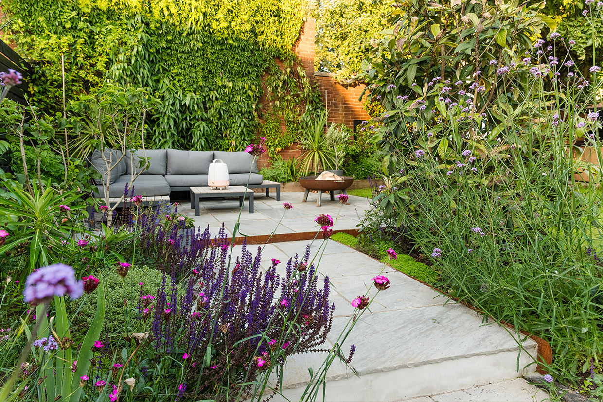 With concealed boundaries, exuberant planting, new trees, a space for the hot tub, a new entertaining space and a bigger space for dining and relaxing, the garden is a delight for the family.